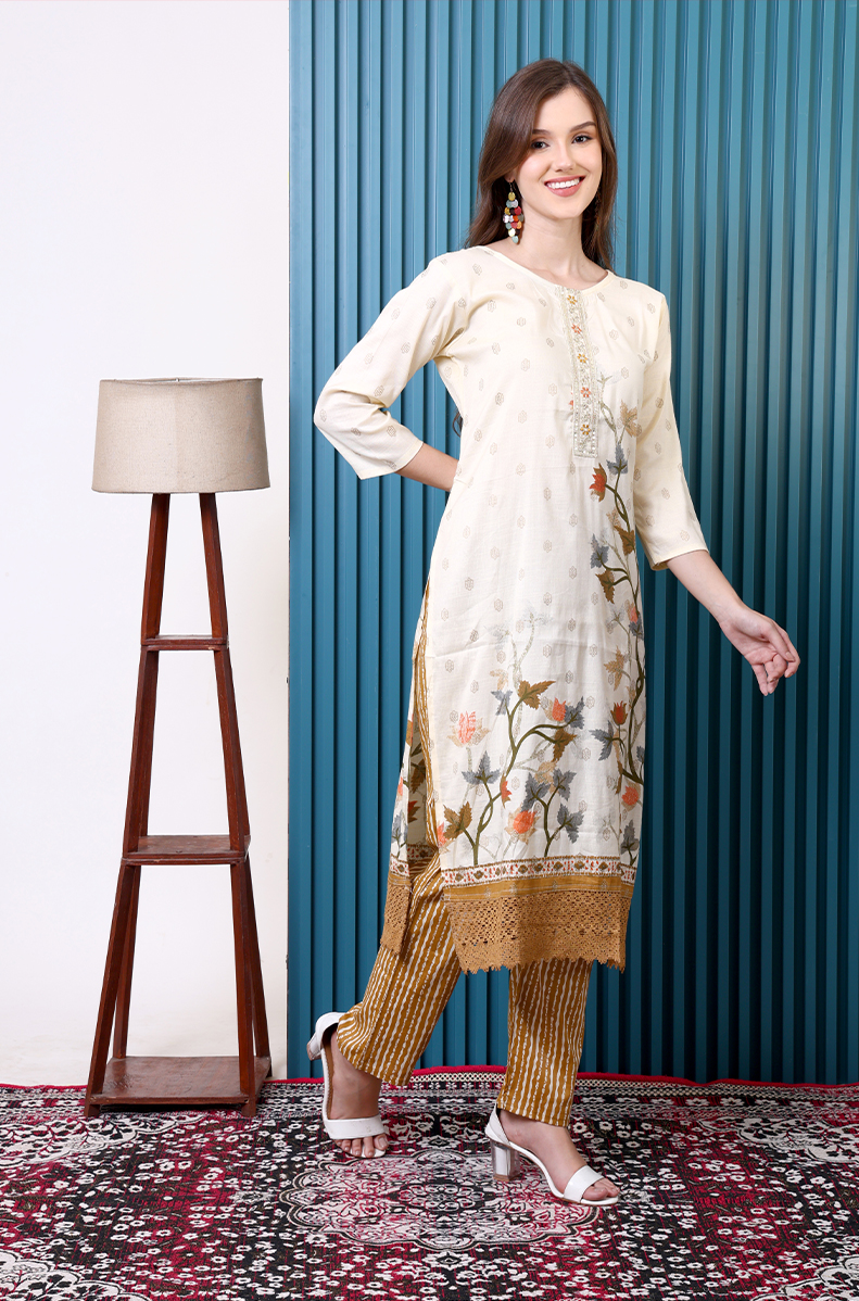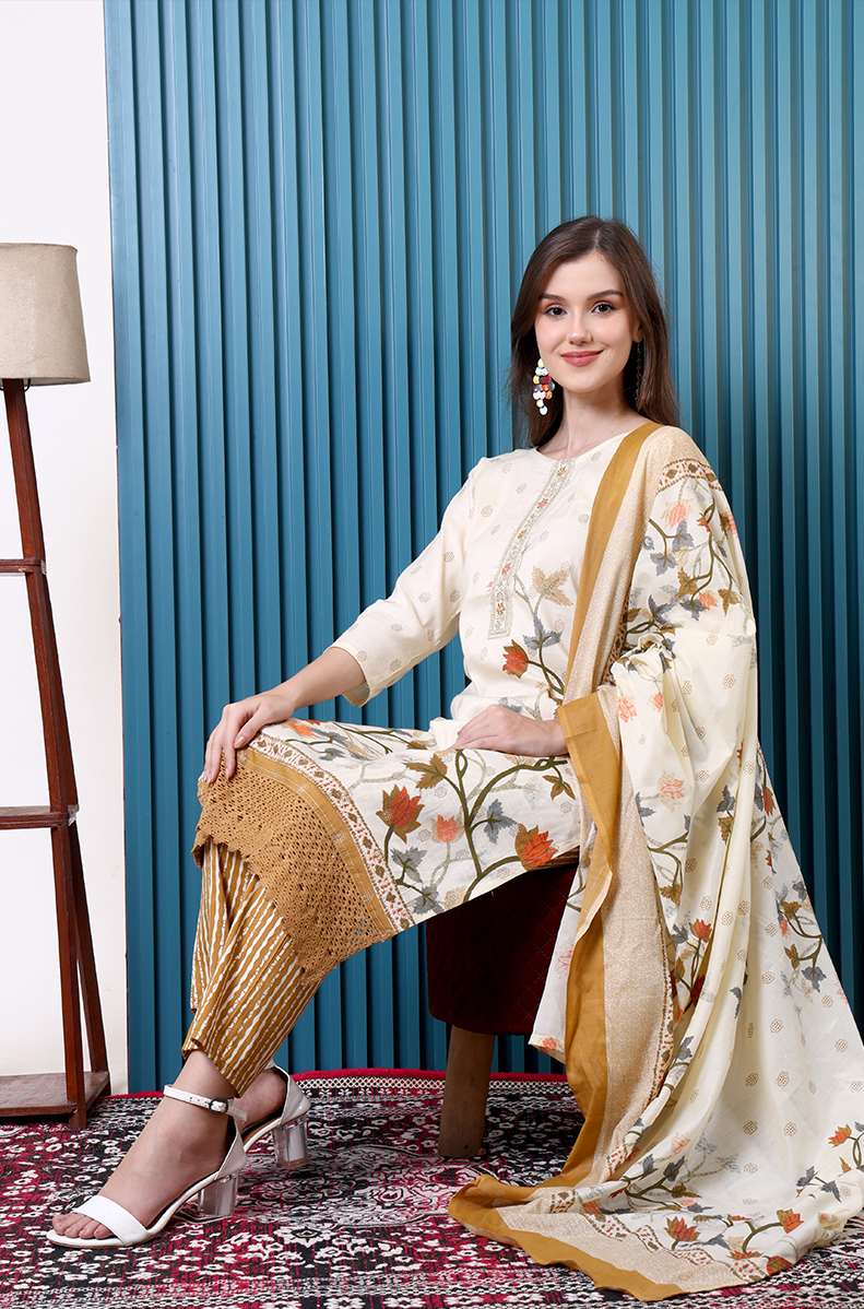 Redefine elegance with this cream cotton pant suit, crafted for all-day comfort. The straight kurta is paired with pants featuring delicate lace at the hem, adding a touch of sophistication. A beautifully printed dupatta completes the look, making it perfect for festive gatherings, casual outings, or office wear. Effortless, graceful, and versatile—this set is a timeless addition to your wardrobe.