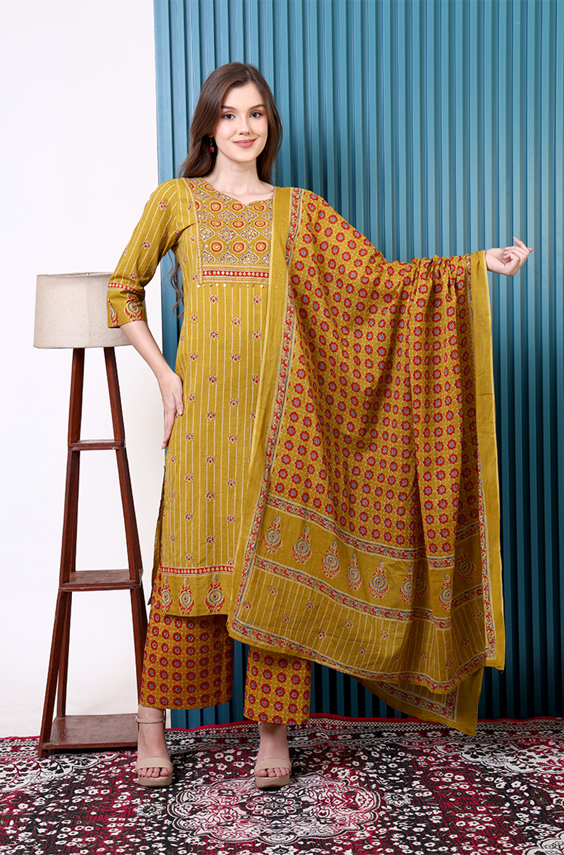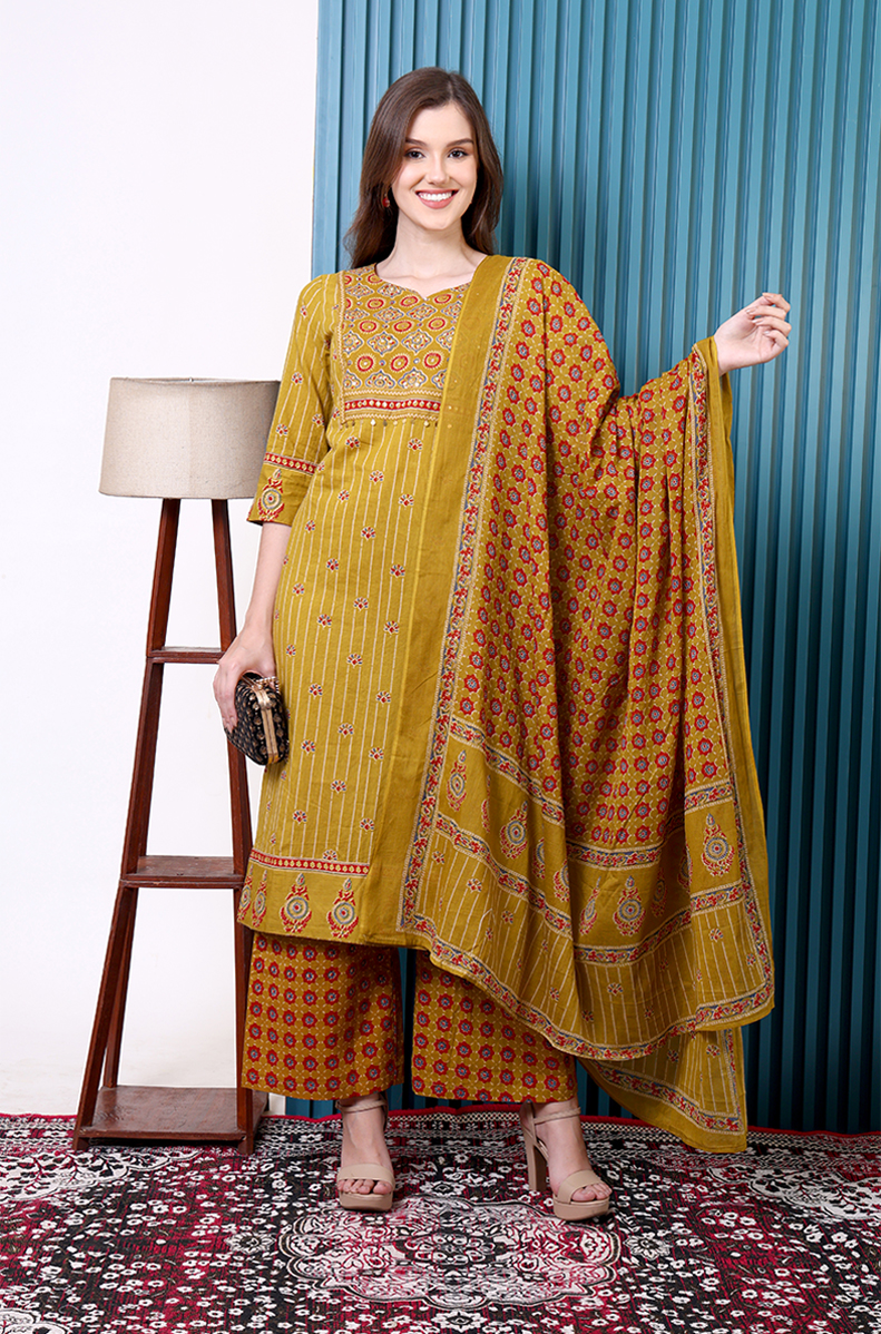 Step into effortless style with this multi-color plazo pant suit crafted in soft, breathable cotton. The straight kurta features elegant prints with intricate detailing on the neckline and borders, paired with matching printed plazo pants for all-day comfort. The coordinated printed dupatta adds a graceful finish, making it a perfect outfit for festive gatherings, casual outings, or office wear. Light, stylish, and versatile — this suit is designed for both elegance and comfort.