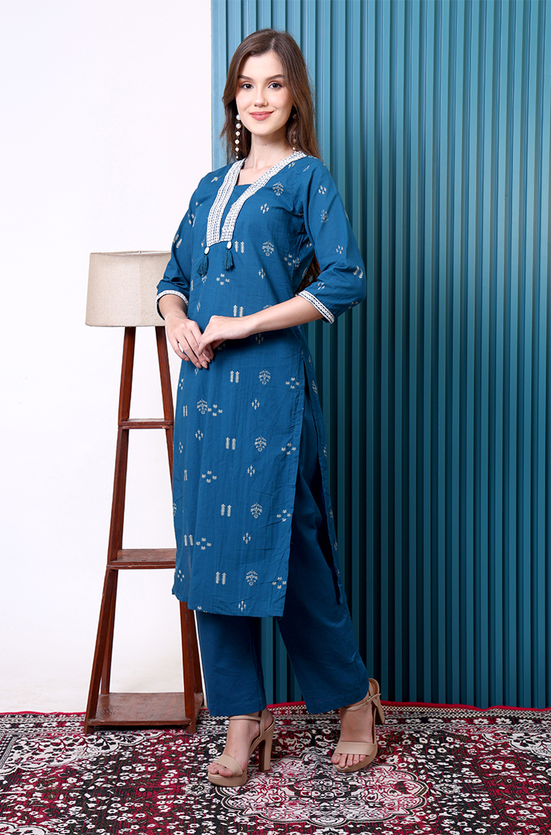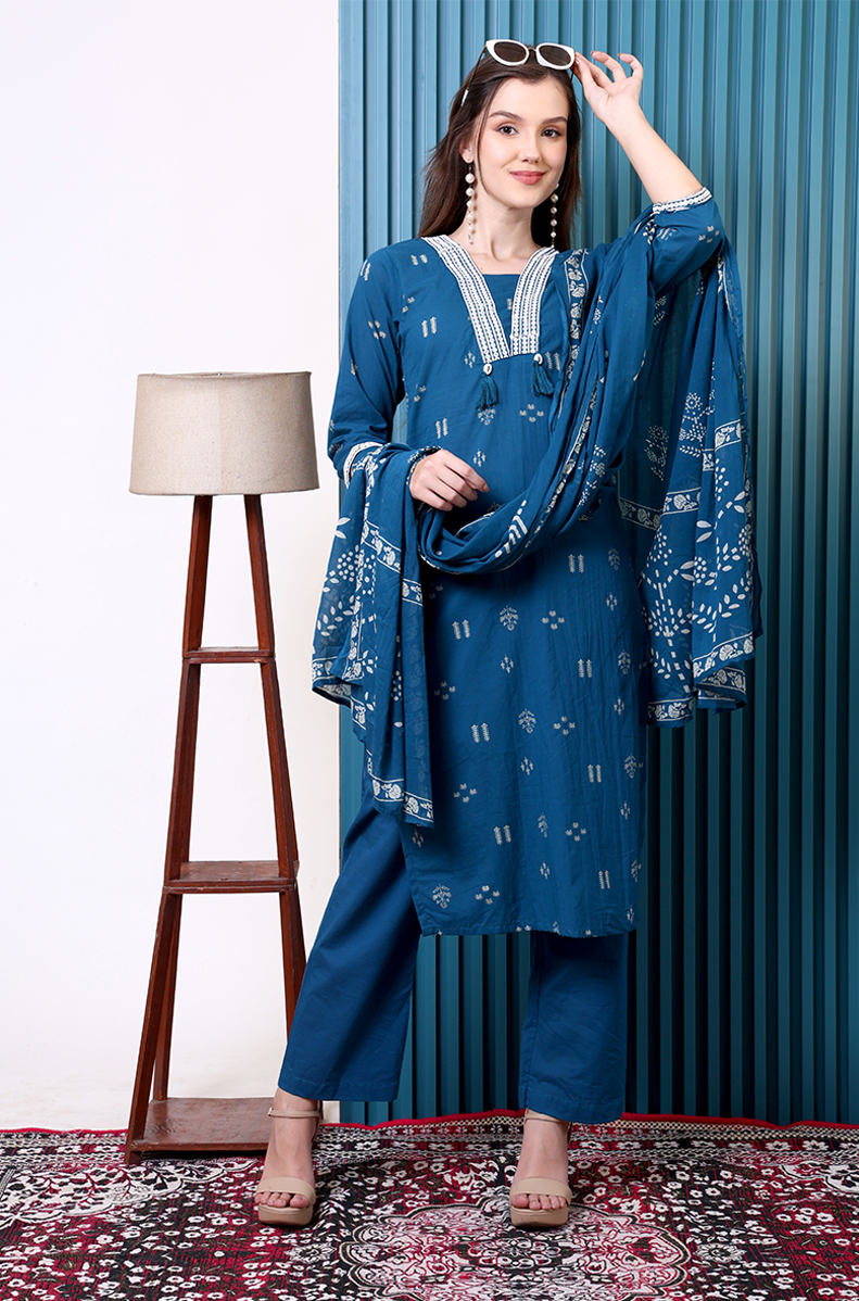 Classic meets comfort in this navy blue cotton pant suit, designed for effortless elegance. The kurta is adorned with subtle traditional prints and finished with a delicately embroidered neckline, paired with straight-fit pants and a matching dupatta for a complete look. Made with breathable cotton, this set keeps you cool and stylish from day to night. A versatile choice for office, casual wear, or small festive gatherings.